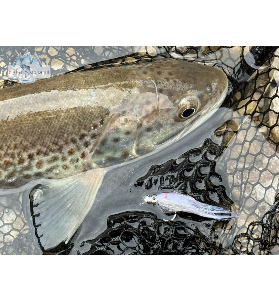 In questo caso circa 4,5 di imitazione di avannotto! Divertente ed efficace da usare in tutte quelle situazioni in cui è presente minutaglia, livelli dell'acqua medi o addirittura bassi e presenza di predatori che non disdegnano una presunta facile preda. Uno streamer gestibile anche con attrezzature leggere e pensato anche per tutti coloro che praticano l'Euronymphing!